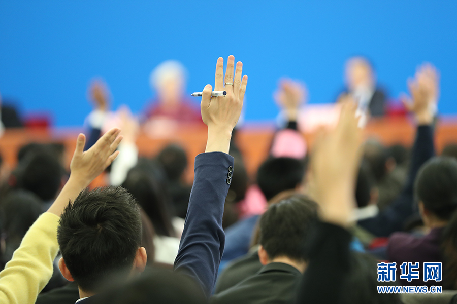 3月15日上午,國務院總理李克強在人民大會堂三樓金色大廳會見采訪十二屆全國人大五次會議的中外記者并回答記者提出的問題。圖為記者踴躍提問。新華網/中國政府網?孫韜 攝?