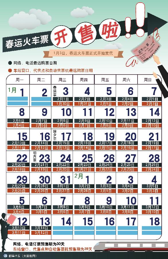 根據往年春運出行特點,初五至初八是返程高峰期。網絡、電話訂票預售期為30天,因此22日至25日將迎返程票搶票高峰。