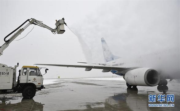 1月4日,銀川河?xùn)|國(guó)際機(jī)場(chǎng)機(jī)務(wù)人員對(duì)飛機(jī)進(jìn)行除冰作業(yè)。新華社記者 王鵬 攝