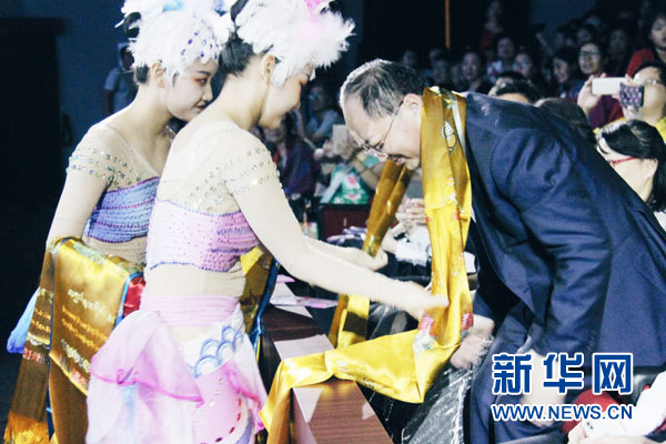 藝術團演員為現場貴賓敬獻哈達。