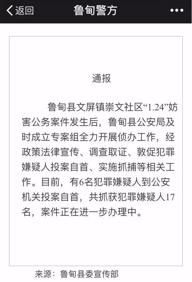 1月26日,云南昭通魯甸縣委宣傳部就“不法者圍攻干警”一事通報稱,目前有6名犯罪嫌疑人已到公安機關投案自首,共抓獲犯罪嫌疑人17名,案件正在進一步辦理中。