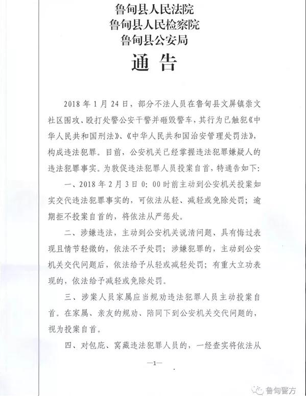 與此同時,魯甸縣公安局、法院、檢察院聯合發出通告稱,部分不法人員在魯甸縣文屏鎮崇文社區圍攻、毆打處警公安干警并砸毀警車,其行為已觸犯《中華人民共和國刑法》、《中華人民共和國治安管理處罰法》,構成違法犯罪,公安機關已經掌握違法犯罪嫌疑人的違法犯罪事實,限期在2月3日凌晨0點前主動到公安機關投案自首、交代違法犯罪事實,可依法從輕、減輕或免除處罰,逾期拒不投案自首的,將依法嚴懲。