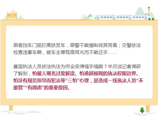 基層執法人員依法執法為何會變得縮手縮腳?半月談記者調研了解到,怕被人曝光過度解讀、怕逾越模糊的執法權限邊界、怕沒有規范指導而犯法等“三怕”心理,是造成一線執法人員“不敢管”“有顧慮”的重要原因。