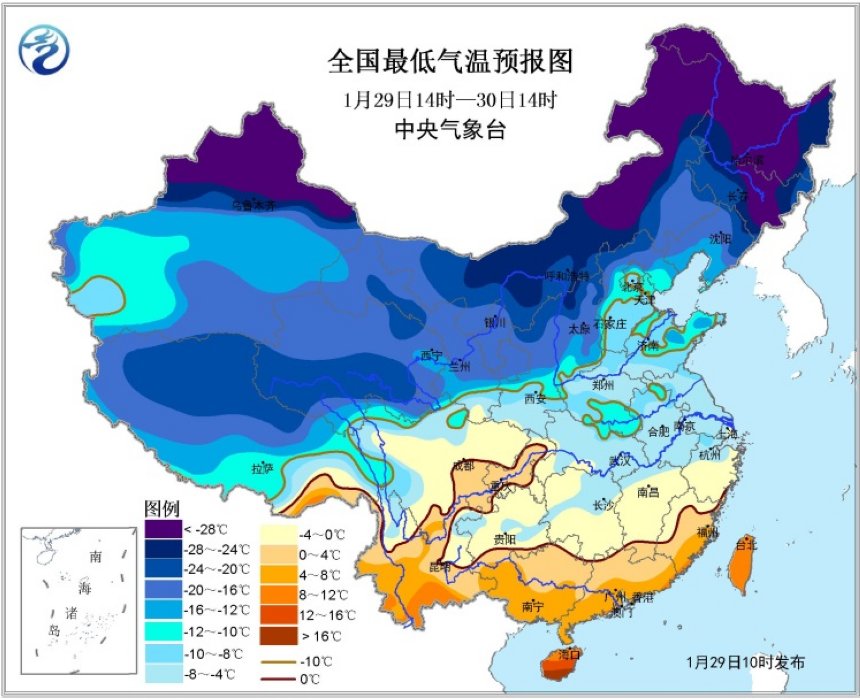 1月29日,中央氣象臺繼續發布寒潮藍色預警。根據中央氣象臺預報,預計2月5日以前,影響我國的冷空氣活動頻繁,且勢力較強,中東部大部地區氣溫較常年同期依然偏低。