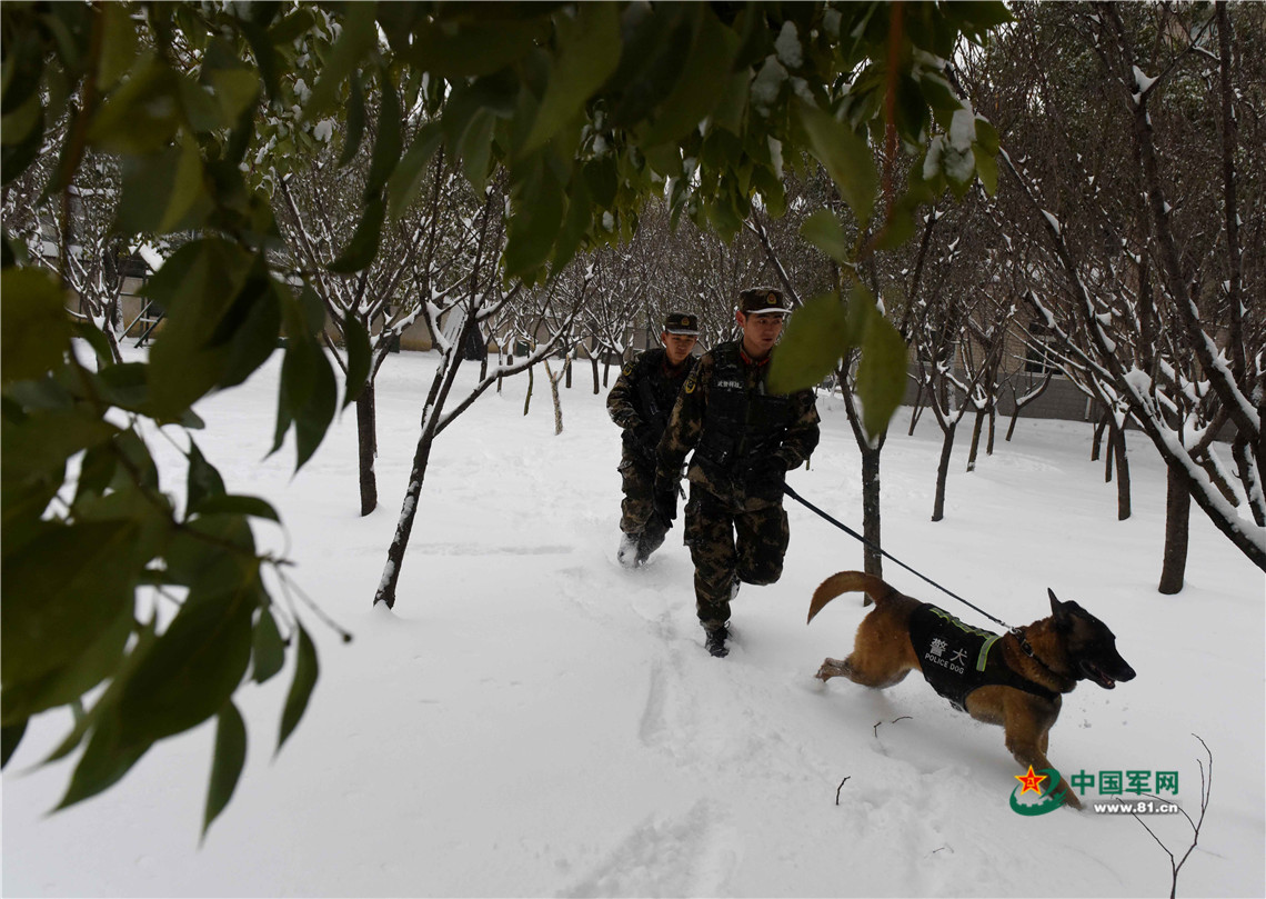 1月27日,武警安徽總隊機動支隊警犬班班長王營廣(前)帶領警犬“魯克”進行武裝追捕訓練。