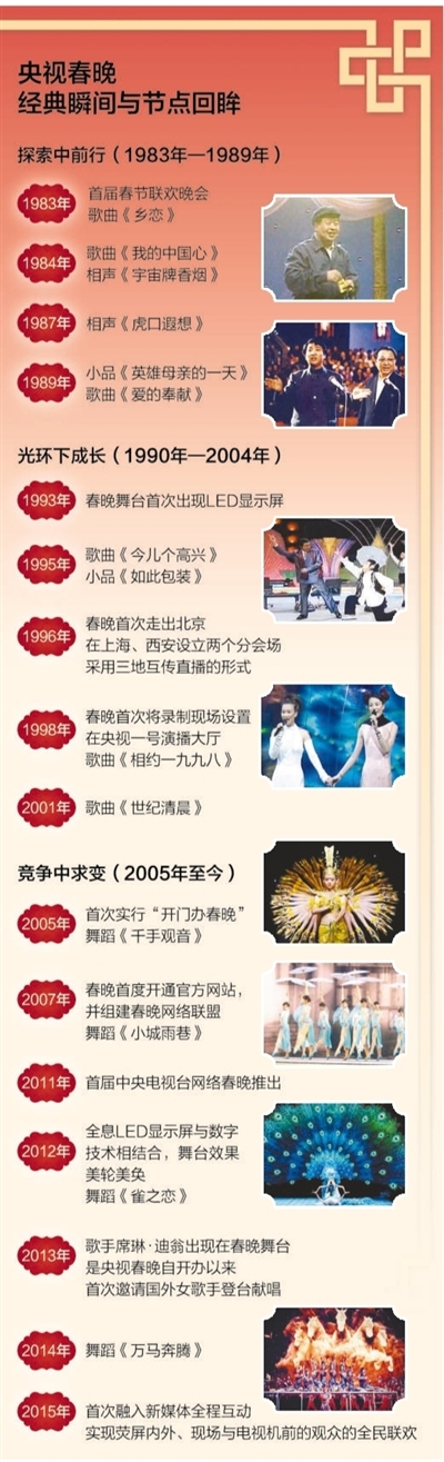 春晚的自我更新還體現在與不同時代的新興媒體展開合作。如八九十年代的電話熱線,90年代末期興起短信投票,以及新世紀以來與微博、支付寶、微信的合作。正是這種在表演形式、舞臺風格上既保持固有特色,又不斷求新求變的創新精神,使得春晚成為每年最受關注的綜藝大餐。