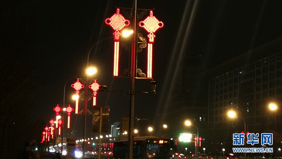 2018年2月13日,長安街兩旁的燈柱整齊地掛滿了象征吉祥福瑞的中國結。新華網 張明宇 攝