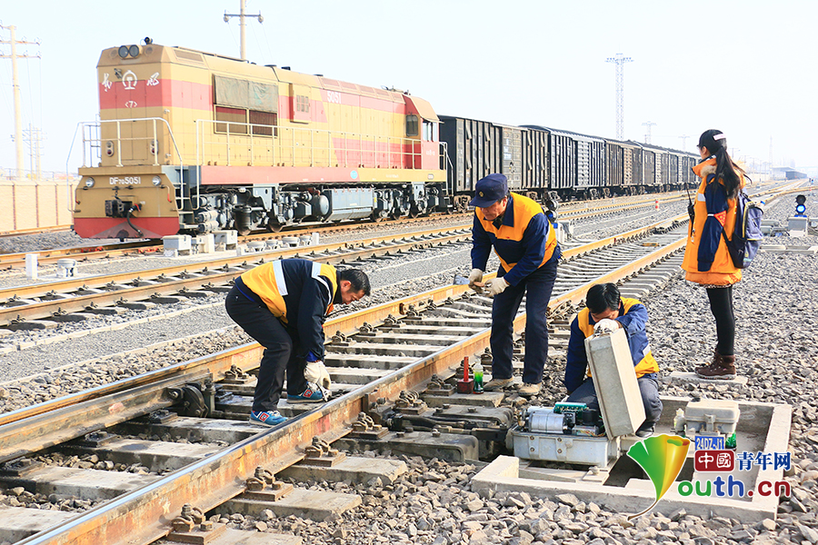 農歷正月初八這天,邰芳鵬和工區3名年輕職工一同到現場,對阿克蘇站信號機和道岔進行巡視檢查。中國青年網通訊員 姚旭東 攝
