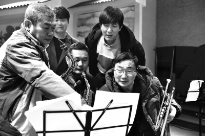 在馬莊村文化禮堂,農(nóng)民樂團(tuán)的成員在排練時討論樂譜。新華社發(fā)