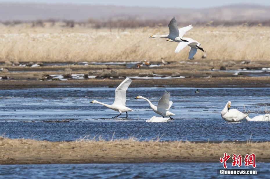 3月20日,天鵝在湖面上嬉戲。日前,內蒙古自治區呼倫貝爾市陳巴爾虎旗陸續迎來大量北歸天鵝。據了解,每年四月份,成群的天鵝從中國南方遷徙到呼倫貝爾產卵繁殖,而今年三月中旬起,陳巴爾虎旗境內便迎來大量回歸天鵝,實屬罕見。中新社記者 武軍 攝
