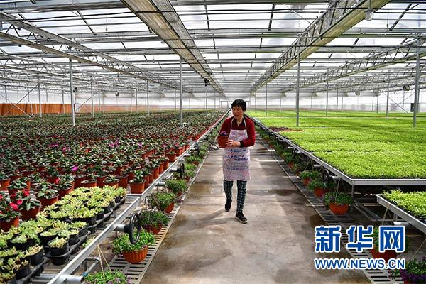 一名女工在秦漢鮮花港的大棚內查看花草長勢(3月27日攝)。新華社記者 邵瑞 攝