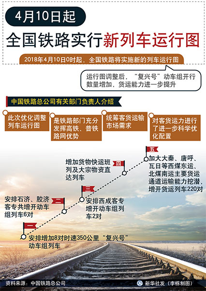 新華社北京4月2日電(記者齊中熙)記者從中國鐵路總公司獲悉,2018年4月10日0時起,全國鐵路將實施新的列車運行圖。運行圖調整后,“復興號”動車組開行數(shù)量增加,貨運能力進一步提升。