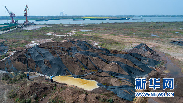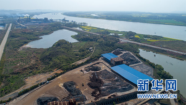 這是3月29日用無(wú)人機(jī)拍攝的安徽貴池前江工業(yè)園內(nèi)池州恒鑫材料科技有限公司廠區(qū)內(nèi)的長(zhǎng)江堤岸旁傾倒的選礦尾渣。新華社記者 郭晨 攝