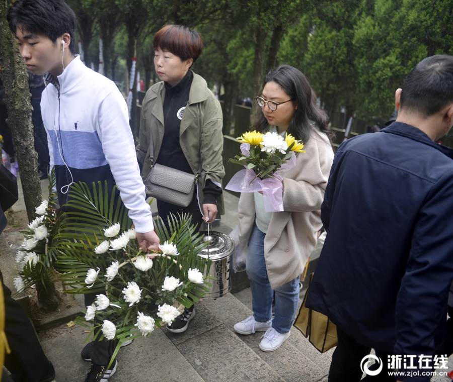 4月5日清明節(jié)上午,前往浙江省定舟山市定海區(qū)清陵掃墓人絡繹不絕,不少掃墓人用鮮花祭祀,寄托哀思懷念逝去的親人,倡導環(huán)保綠色的清明。(浙江在線拍友 胡社友 攝)