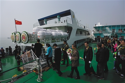 2018年4月2日,天津市濱海新區國際郵輪母港碼頭,全國首艘骨灰海撒專用船“國賓9號”首航,來自北京的逝者親屬們正排隊登船。新京報記者 王飛 攝