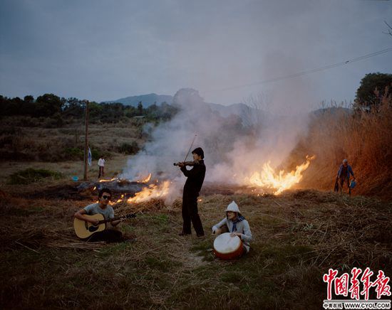 3月14日傍晚,福建省福州市閩侯縣關(guān)中村,“南部生活”共識(shí)社區(qū)成員在墾荒前將蘆葦和野草燒掉,日本建筑師吉富遙樹、社區(qū)發(fā)起人唐冠華和邢振(左至右)見到燒荒的場景,臨時(shí)起意來到現(xiàn)場演奏。