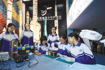 昨日,北京市東高地青少年科技館,學(xué)生在練習(xí)拆裝1:1衛(wèi)星模型。新京報(bào)記者 王嘉寧 攝