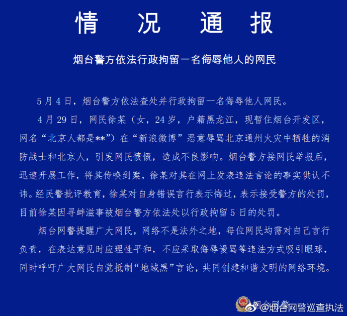 山東省煙臺(tái)市公安局網(wǎng)絡(luò)安全保衛(wèi)支隊(duì)官方微博今日發(fā)布情況通報(bào)。通報(bào)稱,一女子在微博惡意辱罵北京通州火災(zāi)中犧牲的消防戰(zhàn)士和北京人,造成不良影響,因?qū)め呑淌卤粺熍_(tái)警方依法處以行政拘留5日的處罰。