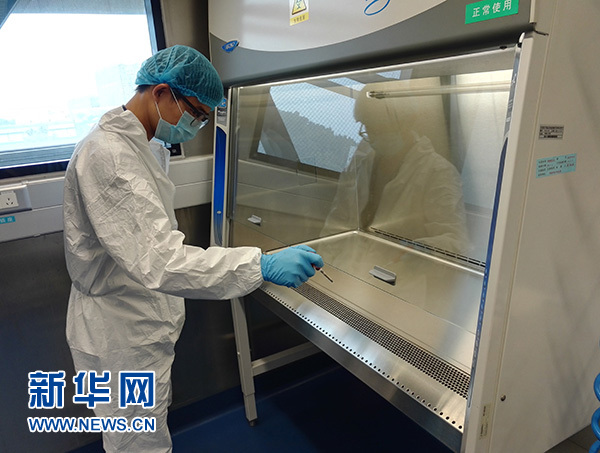 中國科學院武漢病毒研究所暖通設備工程師王亮在武漢P4實驗室測試設備(資料照片)。 新華社發(fā)