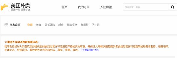 從哪里看違規(guī)餐飲店鋪公示情況?首先,打開三個外賣平臺的網頁版并登陸,選擇“北京地區(qū)”后,可以看到網頁最上端明顯位置發(fā)布了這樣的承諾:“我平臺已經對入網餐飲服務提供者的食品經營許可證進行嚴格的實地審查,并保證入網餐飲服務提供者食品經營許可證載明的經營者名稱、經營場所、主體業(yè)態(tài)、經營項目、有效期等許可信息合法、真實、準確、有效。”