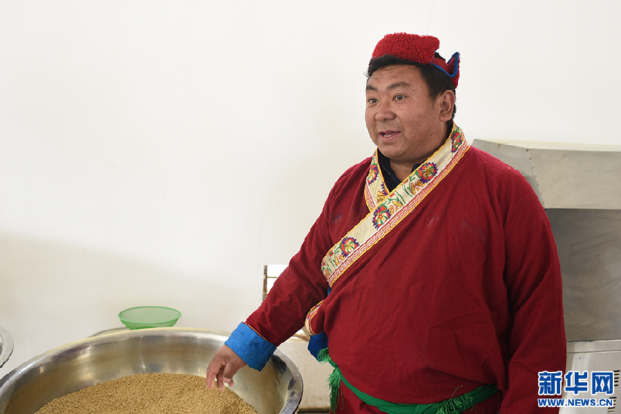 勒布溝特色產品農牧民專業合作社負責人群增次仁向記者介紹情況(5月13日 攝)。新華網記者 陳琳 攝
