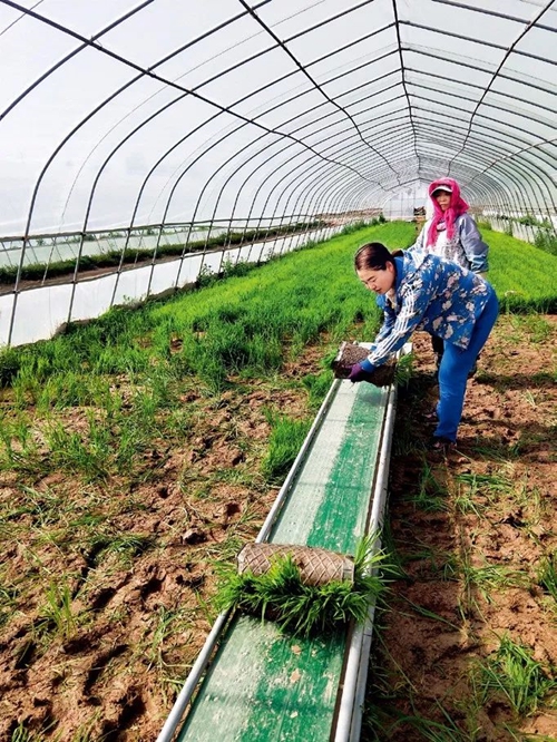 農科大學生呂永杰在寧夏廣銀米業公司育苗基地移植水稻秧苗