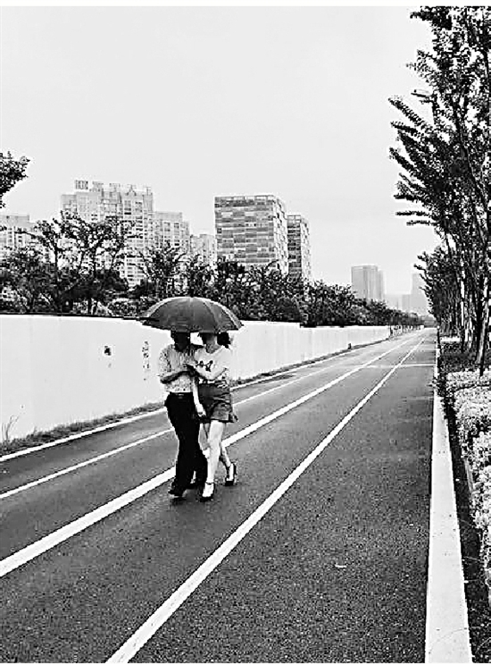 雨中的“最美跑道”依然很美,但跑道之外可就不那么“美”了。記者穿過跑道外側綠化帶時經過聞濤路上的一個停車場,這里地勢高于聞濤路卻滿是積水,一不小心就踩到坑里。停車場外的人行道上也布滿水坑,雖然積水不深,走上一圈,運動鞋濕透。經過這里的路人不約而同地繞開人行道而走大馬路。