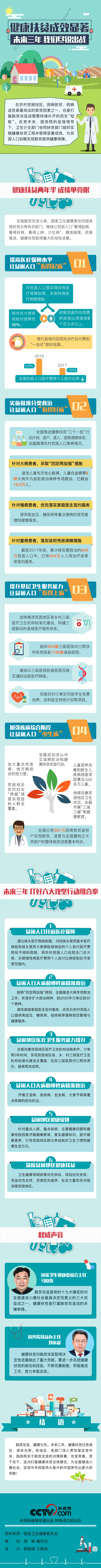 在農村貧困地區,因病致貧、因病返貧是最突出的致貧因素之一,也是打贏脫貧攻堅戰需要持續補齊的民生“短板”。在黨中央、國務院的堅強領導下,國家衛生健康委會同國務院扶貧辦等有關部門,圍繞讓貧困人口“看得起病、看得好病、看得上病、少生病”,精準施策,統籌推進,健康扶貧取得重大階段性進展。未來三年,我國將實施健康扶貧六大攻堅行動,為貧困人口如期實現脫貧提供健康保障。