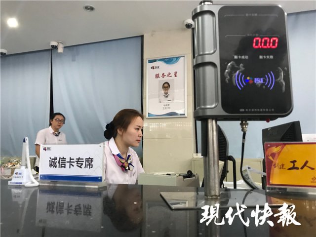 現代快報記者看到,周萍將市民卡交到營業人員手中,經過核驗,確認她為民政部門報送的"誠實守信好市民",點擊升級,不到1分鐘,有著就醫、乘車等功能的市民卡,就變身為"市民誠信卡"。
