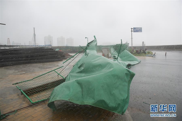 7月22日,在上海吳淞口國際郵輪碼頭,岸邊的防護欄被大風吹垮。據上海中心氣象臺消息,今年第10號臺風“安比”(強熱帶風暴級)的中心已于7月22日12時30分在上海崇明東部登陸,登陸時中心附近最大風力有10級(28米/秒),中心最低氣壓982百帕,登陸后繼續向西北方向移動,強度逐漸減弱。新華社記者丁汀攝