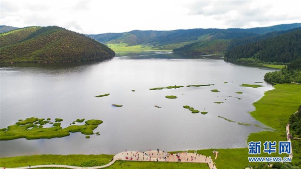 普達措國家公園屬都湖風景(7月19日無人機拍攝)。 新華社記者 胡超 攝
