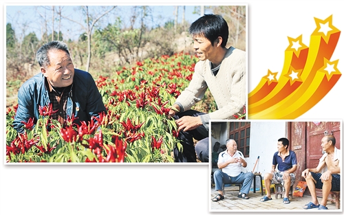 左上圖 張東堂(左)在貧困戶家的辣椒地里查看辣椒長勢。 右下圖 張東堂(左一)來到貧困戶家中家訪。 經濟日報-中國經濟網記者 郭靜原攝