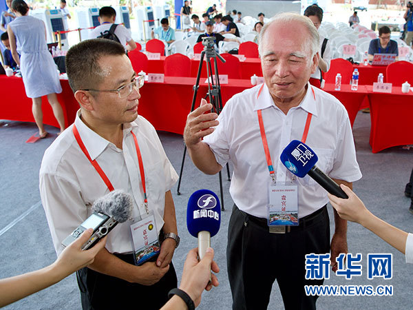 8月5日,在福建晉江舉行的福建向金門供水工程通水現(xiàn)場會上,來自金門的王再生老人(右)和福建省水投集團公司副總經理朱金良(左)接受采訪。 新華社記者 姜克紅 攝