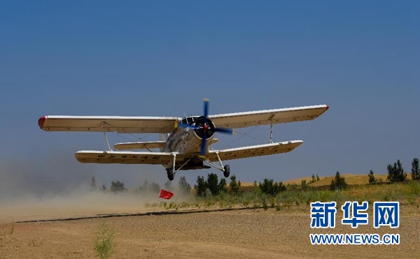在內蒙古鄂爾多斯市的庫布其沙漠腹地,一架飛播造林用的飛機起飛(7月11日攝)。 新華社記者 彭源 攝