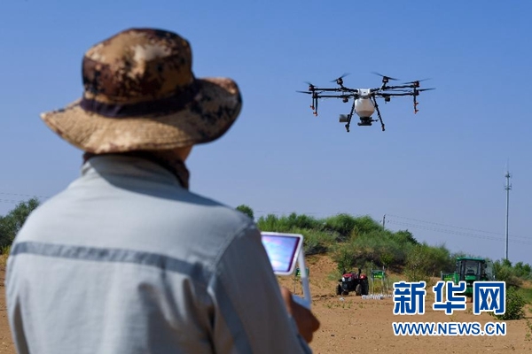 技術人員在內蒙古鄂爾多斯市杭錦旗的庫布其沙漠里操控無人機飛播造林(7月11日攝)。新華社記者 彭源 攝