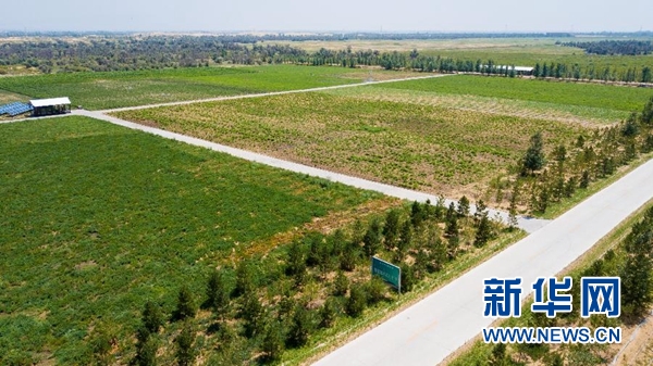 這是位于庫布其沙漠中的億利集團阿木古龍甘草健康產業園(7月11日無人機拍攝)。 新華社記者 彭源 攝