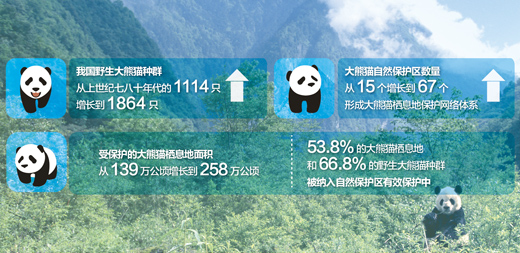 野外調查顯示,我國野生大熊貓種群從上世紀七八十年代的1114只增長到1864只,大熊貓自然保護區從15個增長到67個,形成大熊貓棲息地保護網絡體系。受保護的大熊貓棲息地面積從139萬公頃增長到258萬公頃,53.8%的大熊貓棲息地和66.8%的野生大熊貓種群被納入自然保護區有效保護中。