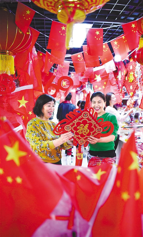 圖⑤ 9月30日,河北省保定市蓮池區西高莊亨佰麗小商品批發城,顧客在選購國慶飾品,歡度佳節。趙昱萱 攝