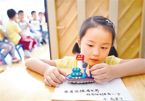 圖⑥ 9月30日,安徽省肥東縣實驗幼兒園御景部開展親子泥塑創意活動,孩子們用彩泥制作國旗慶佳節。許慶勇 攝