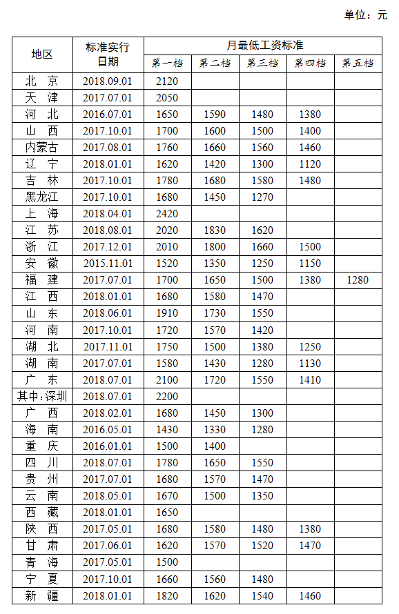 全國各地區(qū)月最低工資標(biāo)準(zhǔn)情況(截至2018年9月),來源人社部官網(wǎng)