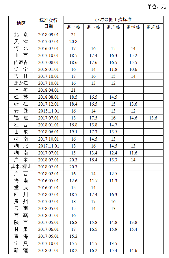 全國各地區(qū)小時(shí)最低工資標(biāo)準(zhǔn)情況(截至2018年9月),來源人社部官網(wǎng)