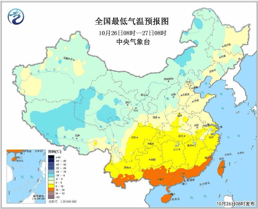 圖為全國最低氣溫預報圖(26日08時-29日08時)