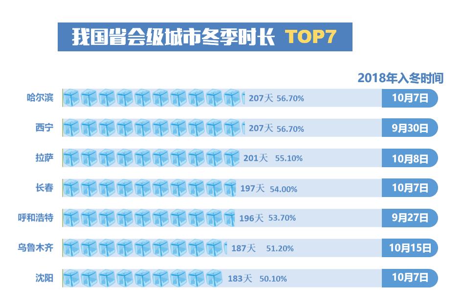圖為我國省會級城市冬季時長前7名以及2018年入冬日期。王若嘉 制圖