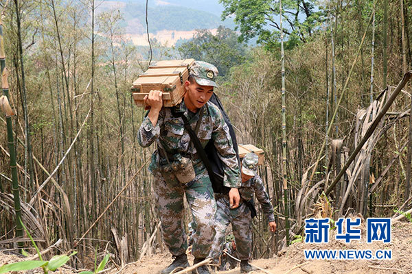 這是杜富國(前)在轉運爆炸物途中(資料照片)。新華社發(黃巧 攝)