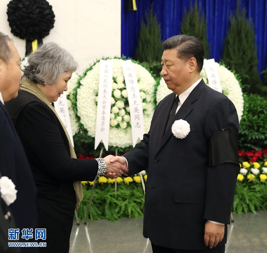 上午9時30分許,習近平、李克強、栗戰書、汪洋、王滬寧、趙樂際、韓正、王岐山、胡錦濤等,在哀樂聲中緩步來到王光英同志的遺體前肅立默哀,向王光英同志的遺體三鞠躬,并與王光英同志親屬一一握手,表示慰問。