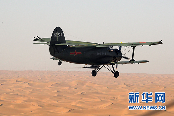 空軍運(yùn)-5B飛機(jī)在騰格里沙漠上空進(jìn)行飛播作業(yè)(5月31日攝)。新華社發(fā)(劉彥令 攝)