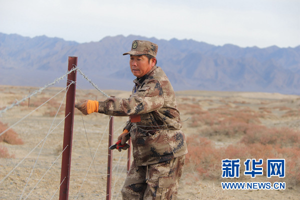 在新疆哈密市七角井鎮(zhèn)七角井村的老村附近,趙金閃在修復(fù)荒漠林圍欄(11月2日攝)。新華社記者孫哲攝