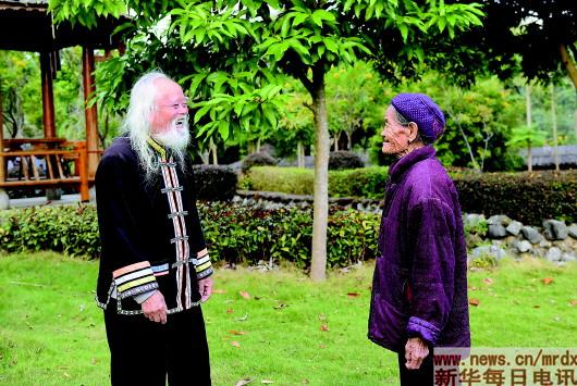 在廣西巴馬瑤族自治縣長壽島,98歲的長壽老人羅耀斌(左)在和一名老人交談(11月8日攝)。 新華社記者陸波岸攝