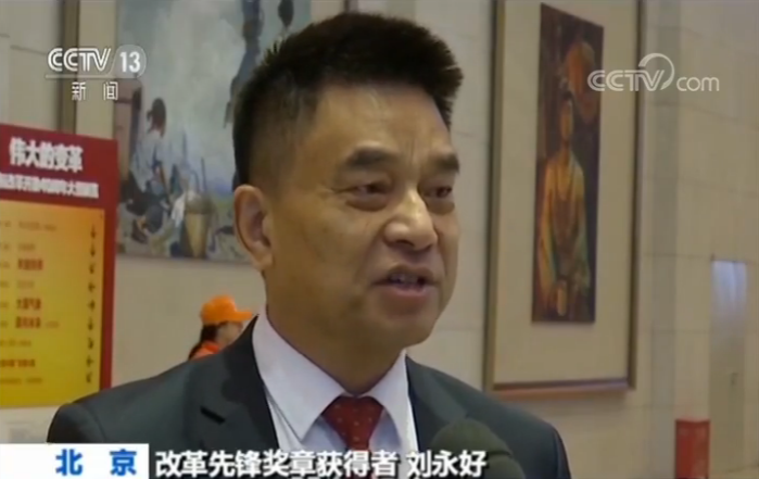 改革先鋒獎章獲得者 劉永好:很榮幸我們趕上這個好時代,趕上這個歷史的機遇,國家鼓勵、支持、推動民營經濟發展的戰略不會變,我們國家改革開放的大門還要越開越大,這也給我們很多民營企業信心。