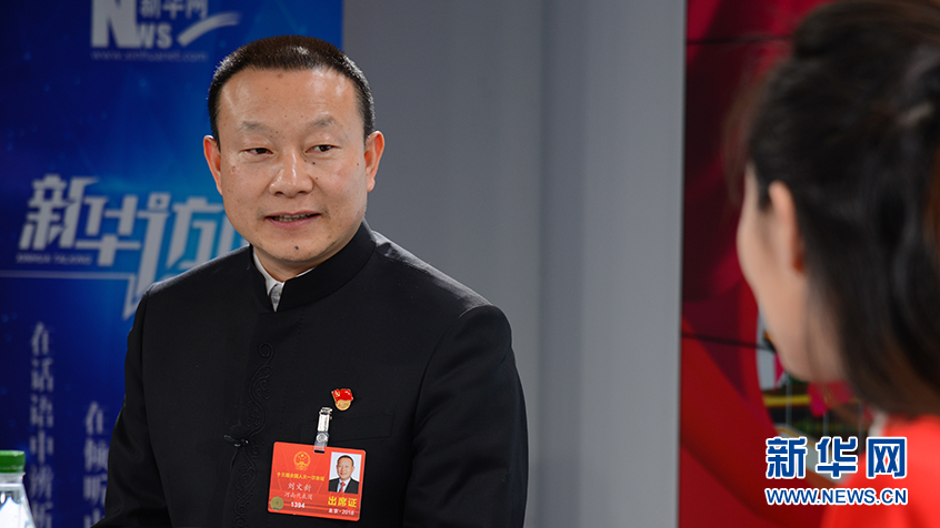 3月7日,全國人大代表、河南省信陽市文新茶葉有限責任公司董事長劉文新(左)做客新華網2018全國兩會特別訪談。新華網 楊濛攝